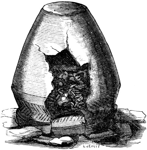12 Although I am describing the position in which the urns have been placed, it must not for a moment be supposed that they are often found in a perfect state, or in the position in which they have originally been placed. On the contrary, the urns are usually very much crushed, and not unfrequently, from pressure of the superincumbent mass of stones and earth, are found on their sides, and crushed flat.
