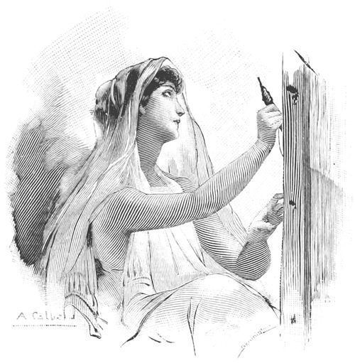 Le soir noir survint, interrompant la musique et la danse; chacun se retira, et Télémaque, l'esprit agité, gagna sa haute demeure précédé par la vertueuse Euryclée, portant deux flambeaux allumés. Euryclée fille d'Ops et petite-fille de Pisénor, était une enfant quand Laërte l'échangea contre vingt bœufs, et il l'honorait dans son palais à l'égal de sa chaste épouse; mais elle ne partagea point sa couche, Laërte craignant la colère de la reine.—Ce fut elle qui éleva Télémaque; il l'aimait plus que les autres servantes. Euryclée, ayant arrangé avec soin la tunique moelleuse, la suspendit près du lit sculpté et sortit de l'appartement; 16 elle tira la porte par l'anneau d'argent et fit glisser le verrou, laissant Télémaque méditer au voyage que Minerve lui conseillait.