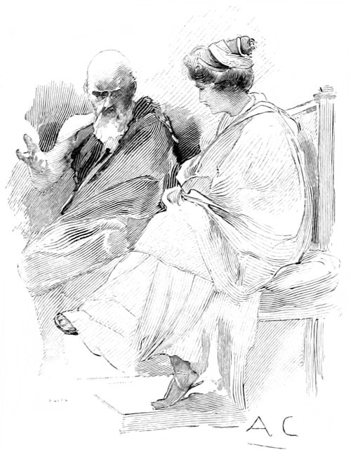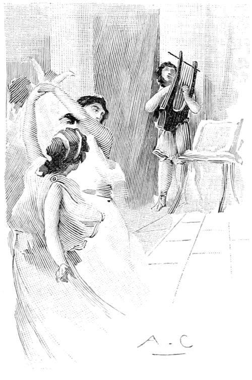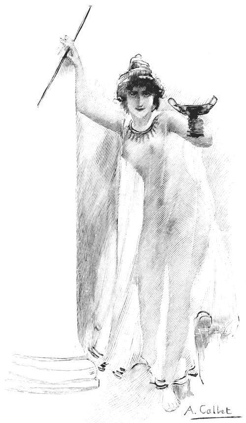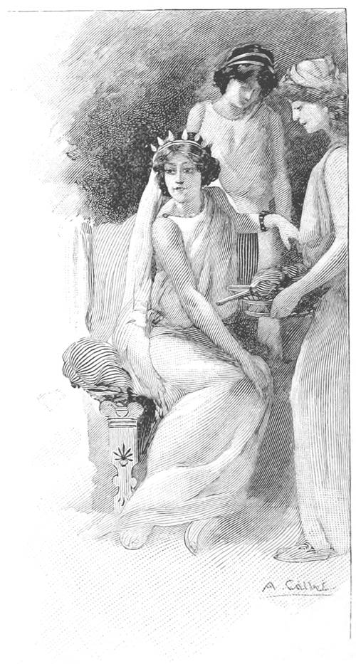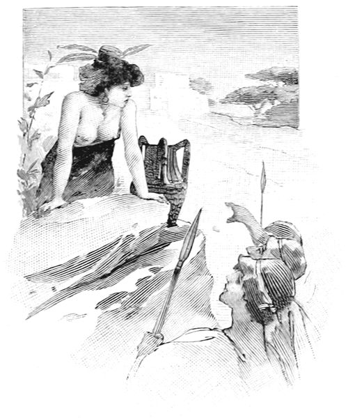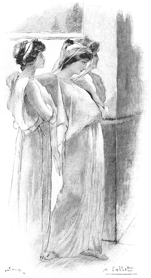 Alors entrèrent les prétendants superbes; les hérauts leur versèrent 7 l'eau sur les mains; des servantes servirent le pain et des serviteurs remplirent les cratères.—La faim et la soif apaisées, un héraut mit une lyre aux mains de Phémios et tandis qu'il préludait, par contrainte, devant les prétendants, Télémaque dit bas à Minerve: