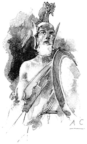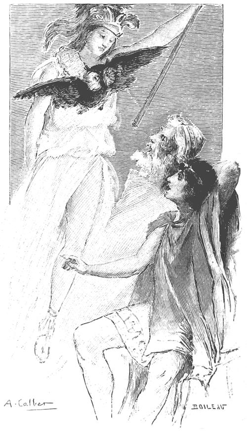 —Ecoutez-moi, habitants d'Ithaque, c'est avec la volonté des dieux immortels qu'Ulysse a pu accomplir ces actions; moi-même j'ai vu 477 aux côtés du héros la divinité qui guidait son bras et jetait la terreur parmi les prétendants.