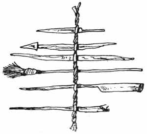 The Battas of Sumatra use different and probably more elaborate messages, as they consist of carefully cut strips of wood, resembling the old spillikins with which our childhood’s days were made happy. These strips of thin wood, about three inches in length, are cut into various shapes which have no obvious collective meaning. In one of them is a capital model of a little broom, accompanied apparently by a series of little clubs and spikes. Such a message might have been sent by an absent brave to his squaw at home, and may have[11] meant that if she didn’t sweep up the wigwam before his arrival she would experience the effect of one or other of the clubs.