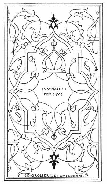 Several of Jean Grolier’s books were bound by French workmen. These are in the main designed on similar lines to those bound by Italians, but there is a difference in the details of the stamps used. One constant difference may be found in the fact that on the Italian books the small leaves and devices are solid, and on the French ones they are azured, or scored across with fine lines. Some of the French bound books have colour added on the fillets.