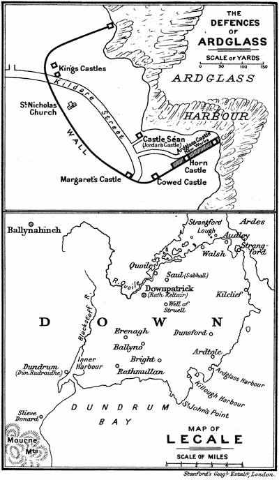From a few fragments we can only guess what wealth was once stored up in Lecale. Wars of Irish and English raged round a harbour so important, as the chiefs of Ulster pressed down against the strangers over a land which had once at Dun Lethglasse held a chief fort of old Ulster kings. O’Neill burned Ardglass of the d’Artois house in 1433: in 1453 Henry O’Neill of Clannaboy was driven back from the town by the help of a Dublin fleet. At the close of the fifteenth century the English almost disappeared out of Lecale. Garrett the Great, Earl of Kildare (1477-1513), claimed Ardglass and the lands about it as heir through his mother to d’Artois, and gained supremacy there—a part of the far-seeing policy by which the house of Kildare was gradually widening its influence from sea to sea, from Ardglass to Sligo and the lower Shannon. His son Garrett Oge had, by grant of Henry viii. (1514), the customs of Strangford and Ardglass, to be held by service[140] of one red rose annually; and still after four centuries heirs of the Fitzgerald house remain at the entrance of Strangford Lough. After the revolt of this Garrett’s son, Silken Thomas (1535), the English marched through the country, burning Lecale. The fall of the Kildares, allies and relatives of the O’Neills, brought a revival of the O’Neill wars for Ardglass, and of the English campaigns. Lord Leonard Grey has left a description in the State Papers (III. 155) of his expedition in 1539: “and so with the host we set forward into the said country and took all the castles there and delivered them to Mr. Treasurer who hath warded the same ... the said Lecayll is environed round about with the sea and no way to go by land into said country but only by the castle of Dundrome.... I assure your lordship I have been in many places and countries in my days and yet did I never see for so much a pleasanter plot of ground than the said Lecayll, for the commodity of the land and divers islands in the same environed with the sea which were soon reclaimed and inhabited....”