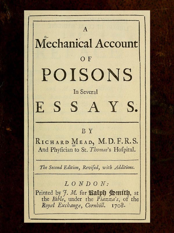 I have attempted somewhat this way in the following Essays; in which I do not promise Methodical, and Finish’d Treatises, but only some short Hints of Natural History, and Rude Strokes of Reasoning; which, if put together, and rightly Improved, may perhaps serve to furnish out a more tolerable SPECIMEN of the DOCTRINE of POISONS, than has yet been Published.