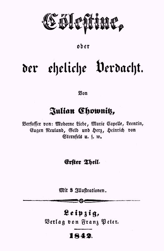 Man sprach sowohl beim Einsteigen als auch während der Fahrt kein Wort. Nur in der Nähe ihrer Wohnung erst war es, wo Cölestine wie aus einem tiefen Schlafe erwachte. „Ach! schon zu Hause?“ sagte sie, und er erwiederte eintönig: „Schon zu Hause!“ Hierauf schwiegen sie wieder. Er hob sie aus dem Wagen. — Vor ihren Gemächern verabschiedete er sich von ihr, indem er vorgab, diese Nacht in seinem Studierzimmer zubringen zu wollen.