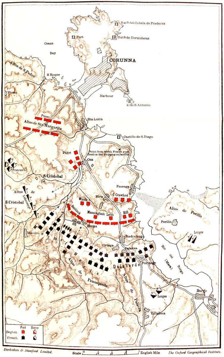 [725] For an account of this combat from the French side see Foy’s report to Delaborde, printed in Girod de l’Ain’s Vie militaire du Général Foy (appendix), where the losses of the brigade are given. On the English side the 92nd lost three killed and five wounded (see Gardyne’s History of the 92nd Regiment). The 14th do not separate their battle-losses from those of the retreat in their casualty-returns. They had sixty-six dead and missing in the whole campaign, and put on board at Corunna seventy-two sick and wounded. Probably not more than ten of the former and thirty of the latter were hit in the battle; if the casualties were any larger on January 16 the losses in the retreat must have been abnormally small in the 14th Regiment.