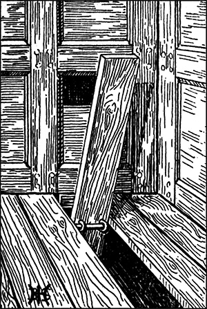 “Let us use some of those stout poles there, standing in the corner,” said Ian; “then we can lever it over.”