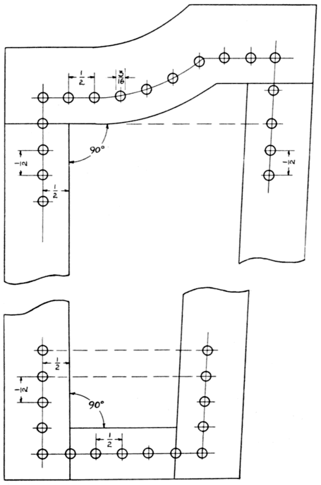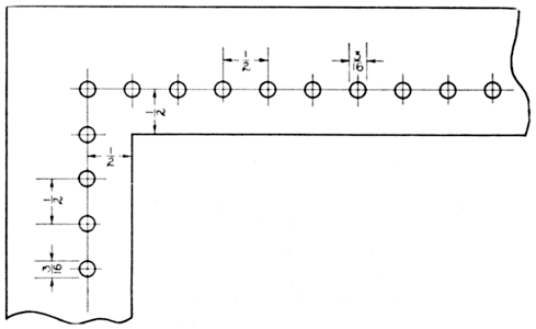 Draw pencil lines entirely around the inner sides of the rails and stiles, ½ in. from the edges. This distance remains constant, usually, on all areas and with canes the various widths. With a pair of dividers set at ¼ in. space off points on the pencil lines, starting from the intersection of the extended lines on each rail. Fig. 3 is a working drawing of a corner, dimensioned as suggested. It will make clearer the directions. It is fundamental that the spacing be done in the same direction on parallel rails, for at times [Pg 10] the last space will be a short ½ in. or whatever dimension is used. In such cases it is necessary to redivide the last several spaces into divisions as near ½ in. as possible. It thus becomes obvious why spacing must be done in one direction as stated. This applies to all rectangular frames.