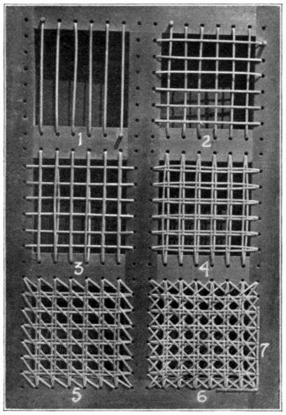 Within the confines of this book a variety of materials has been suggested, and many demonstrated, for seat weaving of various kinds and for weaving on structures other than seats. These will ordinarily afford sufficient latitude for classes of different grade in the school shops, but the instructor or worker should not infer that those indicated include all. Experience in weaving with these materials will suggest new mediums and combinations without [Pg 83] number, and experimentation with new materials by both instructor and pupil should be encouraged.