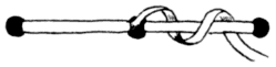Step 3. This step is a repetition of the first two. The canes of this series run over the first and second series and parallel with the first. As each strand is used up bind the end by pulling it under a cane, crossing from one hole to another underneath the frame and cutting off about ¼ in. from the cane. Fig. 5 shows how this binding is done. The loose end at the starting point is tied in this way, and all subsequent ones should be tied as they come, thus avoiding interference by many pegs, and insuring neat binding.