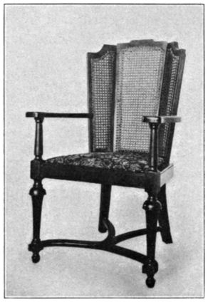 It is frequently necessary or desirable to cover up the cane on the back or inside of an article. This is true of places exposed to view, and is especially advisable on such pieces of furniture as the wingback chair shown in Fig. 7. This chair of William and Mary design was made in a school shop, is hand caned, and of mahogany. The exposed cane is covered with strips of mahogany ¼ in. thick and 1 in. wide in which a groove ⅛ in. deep and ⅜ in. wide has been run. This groove may be made with saw, chisel, or combination plane. Fig. 8 shows a sketch of such a strip. It makes a neat, pleasing cover. Many pieces of so-called expensive furniture have ragged, exposed caning. This is unsightly and is not to be commended.