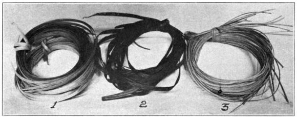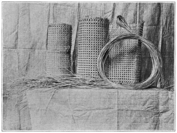 Cane.—Cane is the name applied to a great number of plants which possess long, slender, reedlike stems. The name should apply only to a class of palms called rattans. These plants are found thruout the Indian Archipelago, China, India, Ceylon, and the Malay Peninsula. They grow in dense, dark forests and form a matted undergrowth which makes passage difficult or impossible. These palms are trailing in tendency, yet frequently grow to tree height. They then fall over and lie on the ground. The stem is covered with beautiful green foliage, grows to a length of 100 to 300 ft., and rarely exceeds 1 in. in diameter. The stems are cut into lengths of 10 to 20 ft. for export. The outer bark is stripped into widths varying from ¹⁄16 to ³⁄16 in. These strips are put into hanks of 1,000 lineal feet each. The cane is then ready for the cane weaver. A hank of cane costs from 60 cents to $1. The width of the cane and its quality determines the price per hank. It may be purchased from any upholstery supply house.