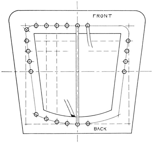 Step 7. Pull a cane of the same size as used in the other steps up thru a hole, over the binder cane and down thru the same hole. A loop is thus formed and the binder secured. Pull taut, then [Pg 14] enter the next hole, pull up the cane over the binder and down, and so on. This operation may be repeated at every other hole when the holes are close together. The two ends of the binder are finally overlapped and secured, and the operation thus completed. At times, when the last strands are woven, it may prove advisable to secure canes underneath the frame by plugging the necessary holes; at least in instances where the canes have a tendency to work loose.