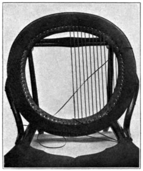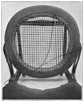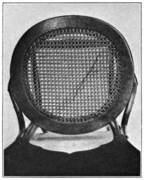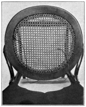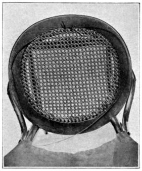 Irregular Areas.—Fig. 9 shows a close view of the back of the chair illustrated in Fig. 7. This is a typical example of an irregular-shaped area for caning. The principles of weaving remain the [Pg 18] same in areas of any shape, yet each requires slightly different treatment. Each has its individual problem. It is necessary to skip some holes altogether. This is never done in rectangular shapes. A close inspection of the photograph will reveal many skipped holes. This is necessary to keep parallel strands equidistant, and diagonals straight.