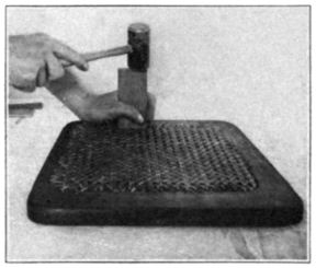 This completes the series or unit, and this unit repeats itself until the area is woven. For instance, the fifth weaver follows the same course as the first; the sixth weaver follows the same course as the second; the seventh the same as the third; and so on. The diagonal effect will remain the same were the weaver to run over [Pg 67] three strands or more, providing the right start is made at the edges of the frame. In using inner hickory bark care must be exercised to keep the strands close together, for they shrink appreciably in drying. A brad hammer with square face is an excellent tool to use for keeping the strands snugly together.