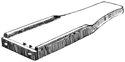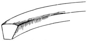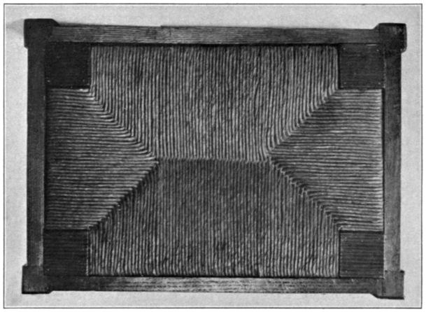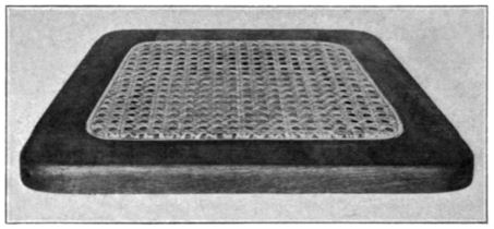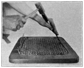 Binders of reed or of wood called “splines” may be used on hand-caned frames. If either is used a groove ¼ in. deep and ³⁄16 in. [Pg 16] wide is cut coincident with the holes before weaving is begun. After the area is caned the strips are fitted and glued in. Use little glue. Tap the splines firmly with a mallet used over a block of wood, until they are flush with the woven cane. Chapter IV gives the method in detail.