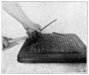 As weaving progresses difficulty will be experienced in inserting cane ends in the holes, due to their becoming filled. Force the scratch awl thru and turn it several times. This will effectively force an opening.