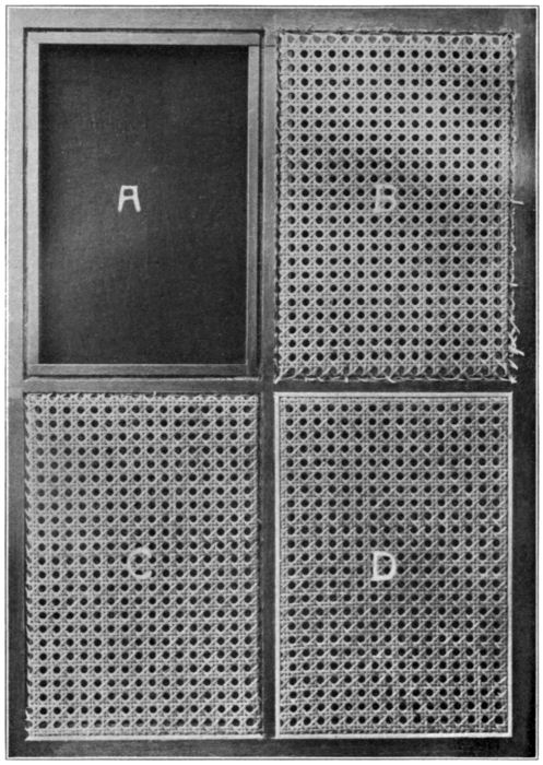 The size of the holes and the distance between them is determined largely by the size of the cane used. Some prefer coarse meshed areas, while others desire them closely woven. There is, however, what we may term a standard mesh. The individual may vary the dimensions given to suit himself. The Jacobean or early caning was invariably of coarse mesh.
