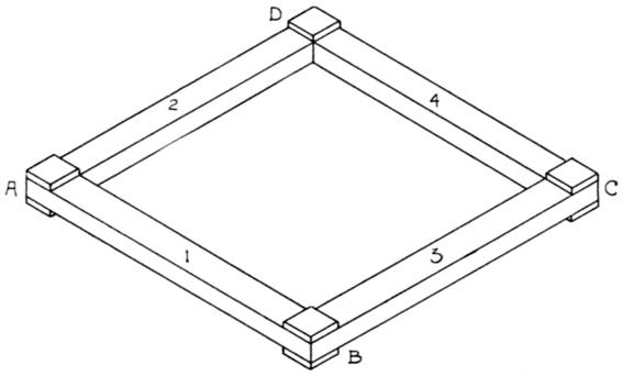 The isometric sketch of a stool, Fig. 67, shows the structure partly woven. It will be noticed that the splints or reeds run both ways underneath the frame as they do on top. As indicated [Pg 79] previously these strands underneath should be woven in some manner to assure a seat of maximum strength for the material used. The diagonal weave was arbitrarily chosen to illustrate the method of weaving the seat frame. The weaving underneath is not shown on the sketch. If the rails on any seat are run flush with the inside corners of the posts the woven strands will fill the entire space. On the other hand, if they are permitted an offset, a series of open spaces are left as shown on the first woven seat illustrated. The sketch shows the rails flush with the inner corner of the posts.