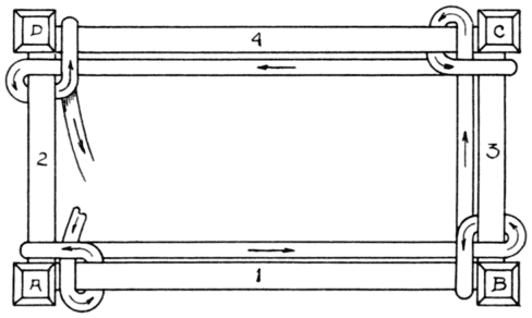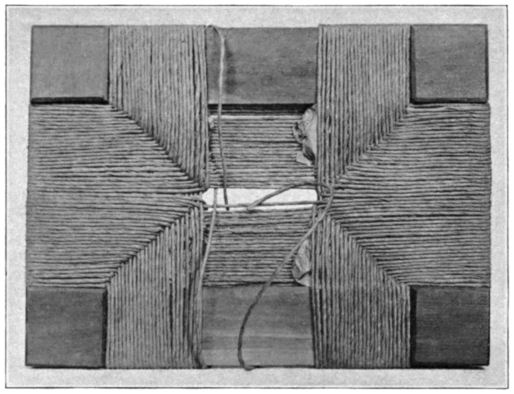 Step 1. A hank of cane should be soaked for a few minutes in warm water, or longer in cold. Do not soak it too long. Start a strand by drawing one end thru a hole next to a corner hole, and let it project about 3 in. below. Fasten with a peg. Then starting [Pg 11] at the peg, pull the entire strand thru the thumb and forefinger to prevent twisting, and pull the end down thru the hole on the opposite parallel rail next to the corner hole, and then up thru the hole next to it. See that the right side of the cane is out on the underside of the frame as on the top. Pull the cane reasonably taut, and fasten with a peg to prevent the strand from slipping back and becoming loose. Draw the cane thru the thumb and forefinger again; pull it across the frame and down thru the hole next to the peg and up thru the hole next to it. Pull taut and fasten with the [Pg 12] second peg. This operation is repeated until all holes have been utilized on the two parallel rails, except those on the corners. Thruout the seven operations it is necessary that the cane be kept from twisting by drawing the remaining part of the strand thro thumb and forefinger.
