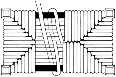 A combination of half-round and flat reed is illustrated in Fig. 56. The half-round reed is wrapped about the frame first, and in this case every other strand is wrapped around the opposite rail, crossing underneath the frame only. The diagonal weave is employed, and is identical to the one just described in general effect. However, the weaver runs over three and under three in the body. Note the difference in the weave at the edges of the rails. When using half-round reed it is necessary that every other strand be [Pg 68] wrapped completely around the rails, for otherwise it would prove practically impossible to weave the area because of the thickness of the reed. A winding reed as shown in Fig. 49 or binder cane could be run continuously, inasmuch as either is relatively thin. Weaving with two kinds of reed will produce an area of pleasing high relief.