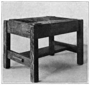 Indian Splints.—Fig. 61 shows a group of stools and a waste basket constructed in eighth grade shops. The tops of the stools and the panels of the basket are woven of hickory splints ½ in. in width. A variety of patterns is shown, and these will suggest other ones. One of the stools has turned posts and the splints are carried over the sides of the rails. With slight modification of the structure, the sides might be woven in a similar manner to the top. The panels of the basket were woven over a separate frame, then they were cut to fit the frames of the basket, and finally tacked on [Pg 73] the frames. The edges of the splints were covered with thin wood strips held in place with brads. These panels should be inserted and secured while damp to assure proper tautness, and to prevent as far as possible splitting the ends of the splints in tacking them to the frames.