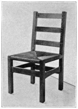 A Rustic Chair.—The type of chair which is particularly adapted to splint weaving is illustrated in Fig. 68. The construction is simple, and the necessary bending of pieces is readily done if a suitable steaming chest is available in the shop. Such a chest may be made of a 6 in. gas pipe cut the required length and threaded at both ends. Cap one end permanently. Have the cap for the other end removable, with a gasket in it to prevent the escape of steam, and a suitable handle attached for ease in removing. Set the pipe upon a standard, then make the necessary steam connections at the closed end and the drain at the other. Place the wood in the chest, screw on the cap, and turn on the steam. The length of time the wood should remain in the steam depends upon the wood and the size of the piece.