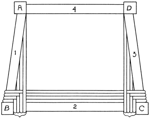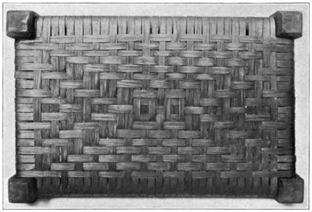 These four strands comprise the unit, and it is repeated until the frame is entirely woven. Complete half of the frame first, then weave the other half, which is just the reverse of the first half. In starting the weave for the second half, strand 1 is omitted, for it is the center of the frame. After the worker has worked out the unit according to the method described, he will find it good practice to write it out graphically as above to use in weaving the seat. The unit above applies to the particular stool, and will not hold good on seats utilizing more strands, or fewer. Errors are easily made in weaving this pattern for the reason that strands need watching at two places. The seat of the stool at the top of the [Pg 71] group shown in Fig. 61 has a pattern identical with this one, except that the strands both ways are close together.