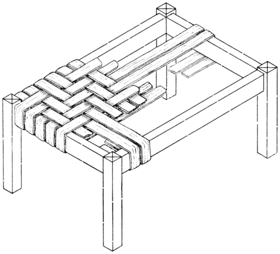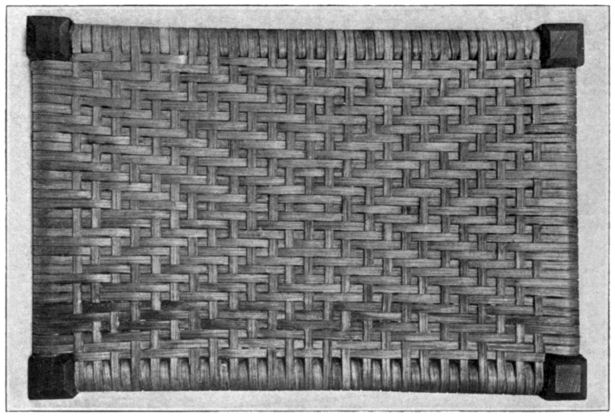 While reeds and inner hickory bark shrink in drying, they will shrink mostly in width and not much in length. Therefore it is necessary to pull all strands, both in wrapping and in weaving, rather tight at all times. Only by doing this will the worker be assured of an ultimately taut seat. This applies also to the Indian splints now to be discussed. As fiber is woven practically dry it needs to be pulled particularly tight.