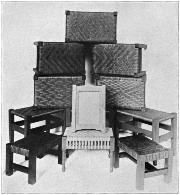 Practically the entire emphasis is laid upon weaving as applied to some form of seat, either as a decorative feature or as a necessary part of the structure. These materials may be utilized in various ways on varied types and forms of furniture other than seats, a few of which are suggested. Experience with them will lead the worker to new and interesting fields of a distinctly educational nature.