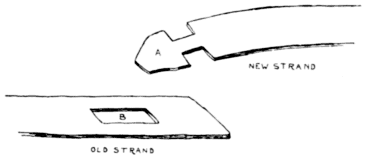 When a strand of usual length has been wrapped about the rails of the seat a second strand needs to be added to continue the wrapping. Tacking the strands to the under side of the rails, as in the case of reeds, cannot be resorted to with splints for the reasons just explained. Therefore some method of fastening strands to each other is necessary. Fig. 62 is a freehand sketch showing a good method. As indicated, a small rectangular piece is cut out of the used strand at B, one inch from the end. A chisel or chip carving knife is good for the purpose. Cut across the grain of the wood first to avoid splitting the splint. The end of the new strand A is notched as shown an inch back from the end, and is then inserted thru B and the two strands thus secured. All subsequent strands are secured in the same manner.