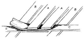 After the wrapping of the opposite rails is completed, the weaving is begun. The use of tacks here is also unnecessary and is inadvisable. Fasten a new strand by overlapping the end of the old one for several inches either on top or underneath the frame. The ends of each will be hidden under cross strands or spokes. Fig. 63 is a sketch illustrating the method of overlapping. AA shows strands running over the weavers, and BB strands running under. D is the end of the old or used strand, and C one end of the new one. C is pulled until the end is hidden under A. It is advisable to overlap the distance of a number of strands and not merely two as the sketch indicates. The sketch merely shows the method. The end of the strand which completes the weaving of the seat is secured underneath the frame by weaving for a short distance in the usual manner.