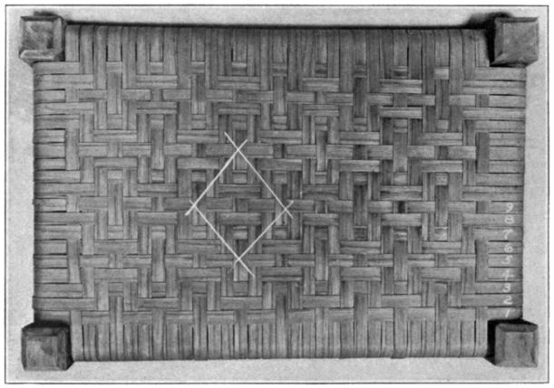 Fig. 65 shows a rather unusual weave. The effect is that of a number of diamond areas over the entire surface, one of which is marked to make the unit or design evident. This design need not begin at the center, but may begin at the edge of the frame as in regular diagonal weaving shown in Fig. 55. The strands comprising the unit are numbered for convenience. The process of weaving is as follows: