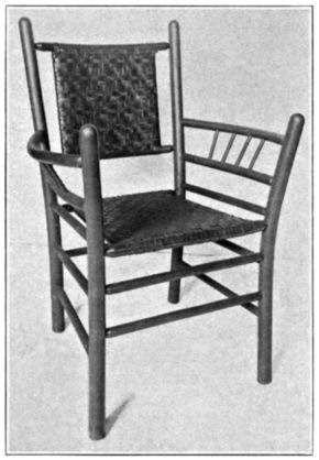 Another excellent material for chairs of similar design and purpose is hickory. It is the best material for the construction of furniture for lawns and porches where weathering is constant, and it is peculiarly adapted to splint and inner bark weaving. If a person lives in the right locality he may gather young second growth hickory saplings in the fall. An instructor could very readily take his classes out on such a wood-gathering expedition. The educational gain in gathering raw materials to be fashioned into finished articles of use and beauty will justify all efforts. In the fall the bark of the saplings will adhere firmly to the wood. Trim and assort the different pieces in accordance with plans, cut them into approximate lengths, and steam and bend those desired. Sand each piece smooth, and proceed to construct the chair according to previous plans. Glue and nail all important joints to prevent any possibility of separation under any weather condition. No finish of any description is necessary or desired on hickory furniture. Weathering will naturally darken both frame and splints, but will not detract in any way from the rugged, pleasing appearance of the article.