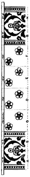 The weaver takes a strip of the pattern and puts it through a widened split in the reed and pins one end of it to the cloth; to the other end he attaches a cord and light weight, which he hangs over the back rail of the loom so that the strip of design will be held steady and move forward as the cloth is drawn up. The strip must be pinned to the cloth so that the first check of the design projects over the fell of the cloth. Suppose the strip to be A, Fig. 199: C is the first check; the weaver sees that this is black, and proceeds to weave the gauze with black weft for the length of this check (one-seventh of an inch). The next check, moving along the strip in the loom, or from left to right on the design, is a different colour, say scarlet; the weaver changes his shuttle and weaves as many checks as there are of this colour, which[296] in this case is only one. Another change of shuttle is made, and so on till the end of the strip is reached; it is then turned, the other end of it being brought to the fell of the cloth, and the checks on the second line of the design are woven in order as before, only they must run from right to left on the design instead of from left to right, as the first line did, which will be caused by the turning of the strip of paper; for it must be borne in mind that if the first shot of chenille weft is put into the carpet from left to right, the next one will be put in from the reverse side or from right to left, so that all the odd numbers of lines on the design-paper should be begun by the weft weaver at the left-hand side, and all the even numbers at the right-hand side, provided the weaver works in this way; in any case one must be the reverse of the other. When all the strips of the pattern are woven, each rib of the piece of weft will be long enough to weave as many shots as are in one repeat of the pattern, and if there be 40 ribs in the piece, it would, when cut up, furnish weft for 40 repeats of the pattern. For weaving this weft large needles are used, somewhat similar to netting needles, which are about 4 ft. long for wide looms; the chenille is wound on these, free from twist, and must be put on so that it will come off correctly to suit the pattern. The strips of chenille are marked to show which end is to be put on the needle first. These needles are pushed through the shed by the weaver when weaving the carpet—put in at one side and drawn out at the other. He lays in the weft as correctly as possible, combing it up to the fell of the cloth, and makes the colours fall in nicely together, drawing it tighter or leaving it slacker as is necessary. Now the advantage of using the special design-paper will be more readily understood. It is plain that if 14 by 7 design-paper be used, instead of 7 by 7, any of the colours may be changed in 1/14 in. on the design; and also in the chenille weaving, when it is desirable to do so, instead of in each 1/7 in. when 7 by 7 paper is used. And if 20 by 7 paper were used, the changes might be still more frequent; besides, in flowing patterns the advantage also comes in to assist in getting the forms more correct, in the same way as paper over square in either warp or weft assists in getting the form of the figure in damask designing over that where only the coarser way of the paper[297] square is used; though the effect is not by any means so satisfactory as if the paper were finer both ways, and square. Yet when one way is fixed by circumstances it is in many cases preferable to alter it in the other way than to leave both alike coarse; but not always so, as, for example, the pattern given in Fig. 199. When these carpets are woven they are passed through a shearing machine, which makes the surface of the pile quite level. They are rich handsome carpets, as well as very durable.