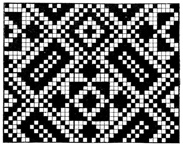 The design paper used is the same as for ordinary work, with a greater number of warp than weft threads, but it is ruled on a large scale so that the pattern will be exactly cloth size. Fig. 198 is a sample of this design-paper for seven picks per inch. The small checks, or what in ordinary weaving would represent the warp threads, have here no reference to them, nor do the warp threads require any consideration when preparing the pattern. The narrow way of the checks is a guide to the weaving of the weft threads. This paper might have been square, seven by seven, and would thus suit for such a pattern as is shown in Fig. 199—supposing seven shots of chenille weft per inch to be correct; but there is an advantage in many cases to have it as it is, or even more off the square, say seven by twenty, which is one of the papers used. This will be most readily understood by following the working out of the pattern.