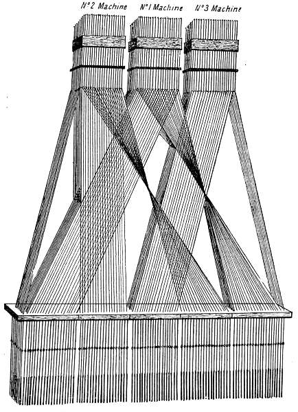The harness twines are furnished with large knots above the cumber board or journals, so that when one of the journals is raised the harness will be lifted with it. The journals may be raised by strong cords or wires from the machine, or by a tappet or shedding motion working either above or below them. If the machine is divided into two parts, four hooks in succession going to each colour of warp[270] for each cloth, the cords from these four hooks making two rows of the journal, there will be no crossing of the harness in a straight or Norwich tie.