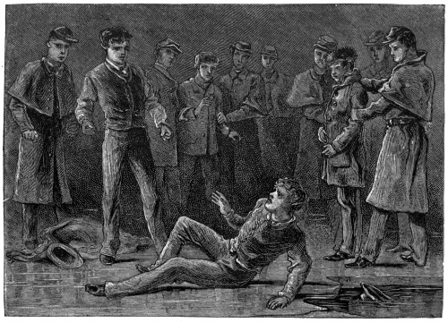 But if these were the sentiments of some of the boys, there was a small but busy minority who cherished feelings that were exactly the reverse—boys who had been sent there because they could not be controlled at home, who were restive under the restraints that were imposed upon them, and whose sole object was to complete the course and get away from the school with as little trouble to themselves as possible. These were the fellows who were always in trouble. They did not mind 9their hard lessons so much as they did the fatiguing drills with muskets and broadswords. They envied the officers in their class on account of the authority they possessed, the extra privileges that fell to their lot, and the respect they demanded from the rest of the students; but they were not willing to work for a commission themselves, and they did not like those who were. They ran the guard at every opportunity to eat pancakes with Cony Ryan, who was quite as important a personage at Bridgeport as Benny Havens is, or used to be, at West Point, and did penance for it the next Saturday by performing extra duty as sentries with bricks in their knapsacks. When they saluted a member of the class above them, as the law required them to do, they did it in a very sullen and ungracious manner; but if a member of the class below them neglected his duty in this respect, they were prompt to take him to task for it.