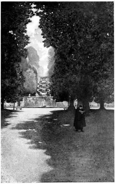 The house at Val San Zibio is built with its back to 238the highroad, and is an unpretentious structure of the seventeenth century, not unlike the Villa de’ Gori at Siena, though the Palladian grouping of its central windows shows the nearness of Venice. It looks on a terrace enclosed by a balustrade, whence a broad flight of steps descends to the gently sloping gardens. They are remarkable for their long pleached alleys of beech, their wide tapis verts, fountains, marble benches and statues charmingly placed in niches of clipped verdure. In one direction is a little lake, in another a “mount” crowned by a statue, while a long alley leads to a well-preserved maze with a raised platform in its centre. These labyrinths are now rarely found in Italian gardens, and were probably never as popular south of the Alps as in Holland and England. The long château d’eau, with its couchant Nereids and conch-blowing Tritons, descends a gentle slope instead of a steep hill, and on each side high beech-hedges enclose tall groves of deciduous trees. These hedges are characteristic of the north Italian gardens, where the plane, beech and elm replace the “perennial greens” of the south; and there is one specially charming point at Val San Zibio, where four grass-alleys walled with clipped beeches converge on a stone basin sunk in the turf, with four marble putti seated on the curb, dangling their feet in the water. An added touch of quaintness is given to the gardens by the fact that the old waterworks are still in action, so that the unwary visitor, assailed by 239fierce jets of spray darting up at him from the terrace steps, the cracks in the flagstones, and all manner of unexpected ambushes, may form some idea of the aquatic surprises which afforded his ancestors such inexhaustible amusement.