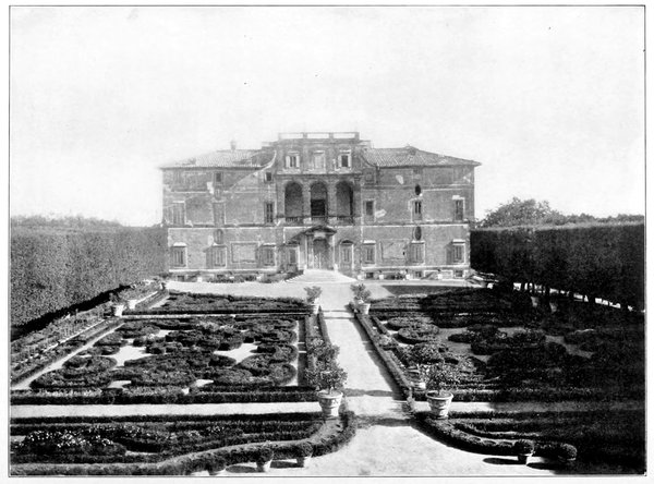 But Palladio was a great artist, and if he was great in his civic architecture rather than in his country houses, if his stately genius lent itself rather to the grouping of large masses than to the construction of pretty toys, yet his most famous villa is a distinct and original contribution to the chief examples of the Italian pleasure-house. The Villa Capra, better known as the Rotonda, which stands on a hill above Vicenza, has been criticized for having four fronts instead of one front, two sides and a back. It is, in fact, a square building with a projecting Ionic portico on each face—a plan open to the charge of monotony, but partly justified in this case by the fact that the house is built on the summit of a knoll from which there are four views, all equally pleasing, and each as it were entitled to the distinction of having a loggia to itself. Still, it is certain that neither in the Rotonda nor in his other villas did Palladio hit on a style half as appropriate or pleasing as the typical manner of the Roman villa-architects, with its happy mingling of freedom and classicalism, its wonderful adaptation to climate and habits of life, its capricious grace of detail, and its harmony with the garden-architecture which was designed to surround it.