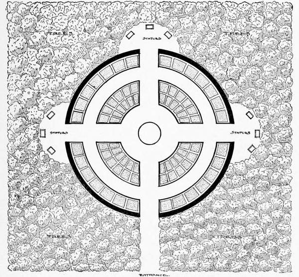 There are few gardens in Italy comparable with Val San Zibio; but in Padua there is one of another sort which has kept something of the same ancient savor. This is the famous Botanic Garden, founded in 1545, and said to be the oldest in Italy. The accompanying 240plan, though roughly sketched from memory, will give some idea of its arrangement. Outside is a grove of exotic trees, which surrounds a large circular space enclosed in a beautiful old brick wall surmounted by a marble balustrade and adorned alternately with busts and statues. The wall is broken by four gateways, one forming the principal entrance from the grove, the other three opening on semicircles in which statues are set against a background of foliage. In the garden itself the beds for “simples” are enclosed in low iron railings, within which they are again subdivided by stone edgings, each subdivision containing a different species of plant.