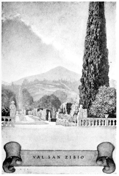 Some of those who have fallen under the spell are inclined to ascribe the Italian garden-magic to the effect of time; but, wonder-working as this undoubtedly is, it leaves many beauties unaccounted for. To seek the answer one must go deeper: the garden must be studied in relation to the house, and both in relation to the landscape. The garden of the Middle Ages, the garden one sees in old missal illuminations and in early woodcuts, was a mere patch of ground within the castle precincts, where “simples” were grown around a central wellhead 7and fruit was espaliered against the walls. But in the rapid flowering of Italian civilization the castle walls were soon thrown down, and the garden expanded, taking in the fish-pond, the bowling-green, the rose-arbour and the clipped walk. The Italian country house, especially in the centre and the south of Italy, was almost always built on a hillside, and one day the architect looked forth from the terrace of his villa, and saw that, in his survey of the garden, the enclosing landscape was naturally included: the two formed a part of the same composition.