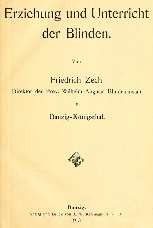 [6] Wohl gibt es Blinde, die ein Gymnasium und eine Universität besuchen; dies kann aber erfolgreich nur dann geschehen, wenn sie durch speziellen Blindenunterricht eine entsprechende Vorbereitung empfangen haben.