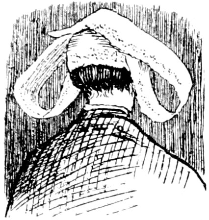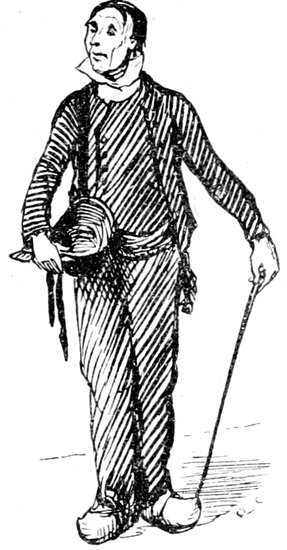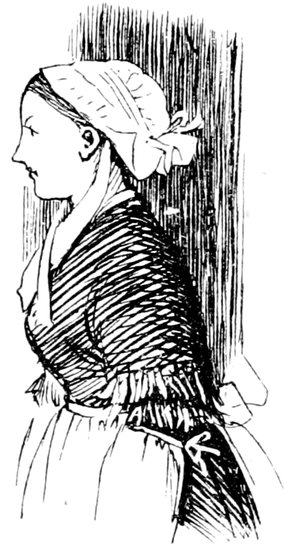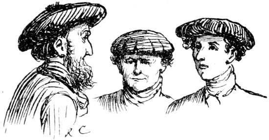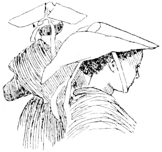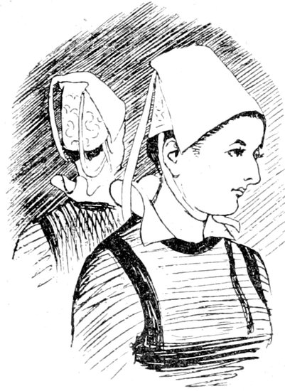 The streets of Guéméné are full of people on Sunday morning—men in short jackets, wide trousers, and black, broad-brimmed hats, old women in the comfortable coiffe sketched above, girls with white caps and stomachers, short dresses, and neat shoes, all coming into the church and afterwards meeting in the street. These are principally country people; but the inhabitant of Guéméné, the small propriétaire or employé, who lives in the town, often wears a semi-nautical attire, as sketched overleaf.