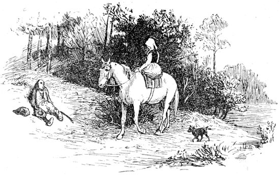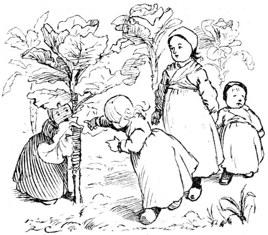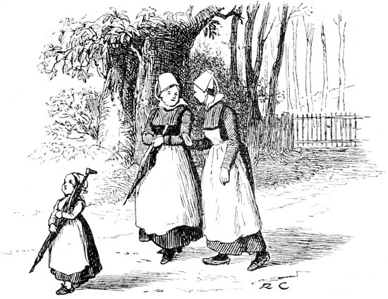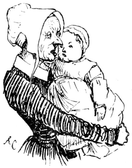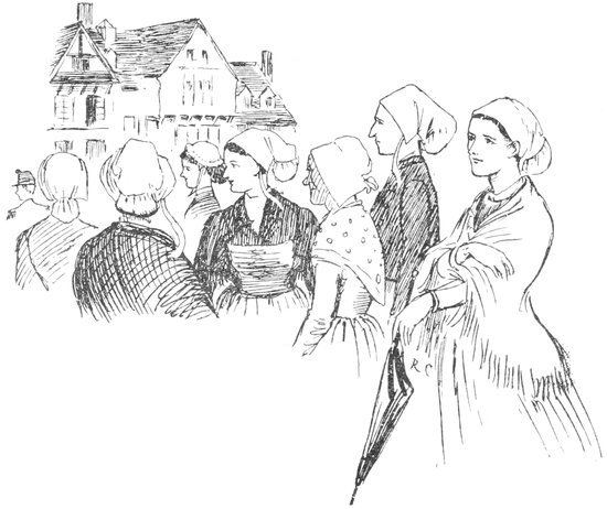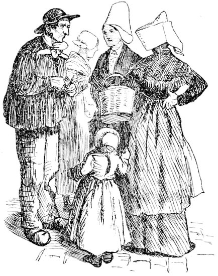 Five old women sit together in the road, their chairs drawn together for company, and to make an inclosure for two or three little tottering inhabitants of Guéméné, who at the age of three are dressed in the costume of their ancestors. Here the harmony of costume and architecture, both in form and colour, strikes the eye at once, and we want nothing to complete the picture. There is nothing, it seems, to add, nothing to leave out; let us stay for a month (we are inclined to say) and sketch in the high-street of Guéméné such figures as are standing talking together at an old-fashioned doorway, opposite to our inn. But the scene soon changes, and out of one of the old houses, dark in the interior, with a floor below the level of the street, comes a lady with a nurse and child; she has a light dress with a train, a hat with scarlet feathers, and a parasol. She is going for a promenade, and, as she passes down the street, is greeted by the old women thus: “See they carry their tails in their hands, these fine demoiselles!”