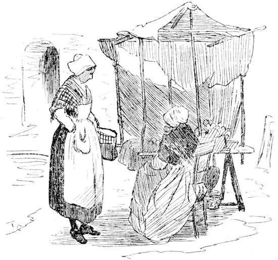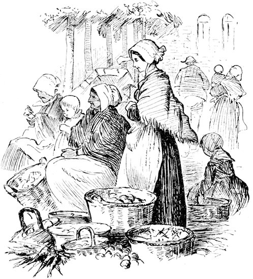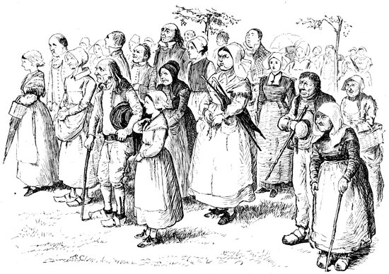 What those upturned faces were, and what the good bishop saw beneath him in the crowd, as he rolled forth a discourse full of 176earnestness and eloquence, the pencil has recorded in the sketch. It gives, as no words could describe, the mingled expression of feeling on the faces of the pilgrims, and tells more eloquently than any argument that the influence of the Church is on the wane in Brittany. The words spoken are the old story: first the history of “the miracle of Ste. Anne,” then an exhortation as to the importance of confession and of works of charity and masses for the dead. The costume of the people that listen is nearly the same as in 1623, when Ste. Anne appeared in a wheat-field to a peasant; and yet—and in spite of all accounts of the earnest devotion of the people—if we look at the aspect of the crowd, we seem to understand the matter better than we ever did before.