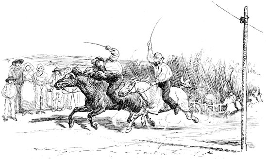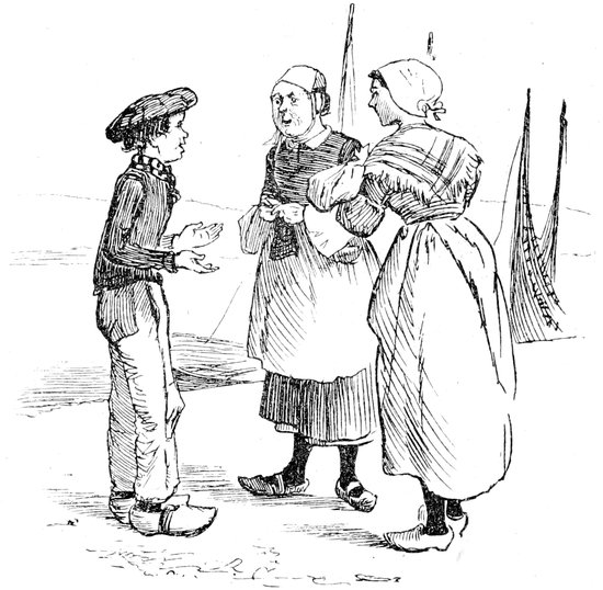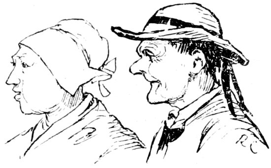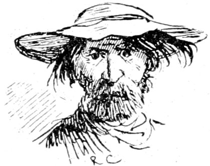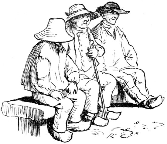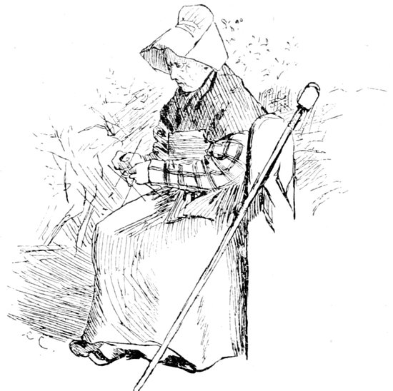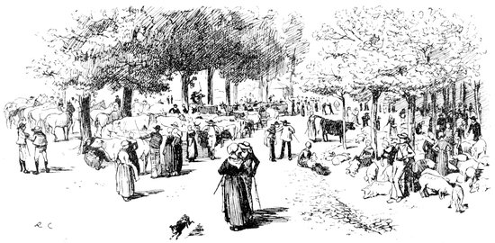 Outside the café, seated on a bench, is a French commercial traveller, dressed like a common dandy from L’Orient, with blue frock-coat, white trousers, very narrow at the bottom, hair cut close to the head, and a portentous moustache; and he does with it what 194every human creature seems to do with an artificially contrived tuft of hair on his upper lip, he twitches it round and round and pulls at it without ceasing; he has done this every day for many years, and the action, apparently, relieves his mind. The sight is familiar in civilised communities, but this figure contrasts so strongly with the clean-faced, dignified Bretons that it seems time to pack up our sketchbooks and depart.
