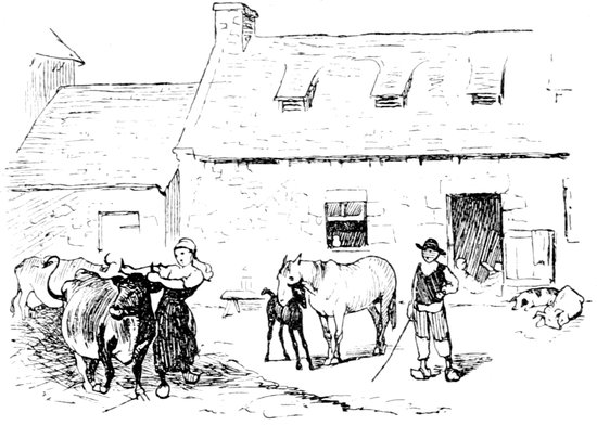 Breton Folk is not a description of the antiquities of Brittany, nor even a book of folk-lore. It is a series of sketches of a “black-and-white country” under its summer aspect; of a sombre land shrouded with white clouds, peopled with peasants in dark costumes, wide white collars and caps, black and white cattle and magpies.