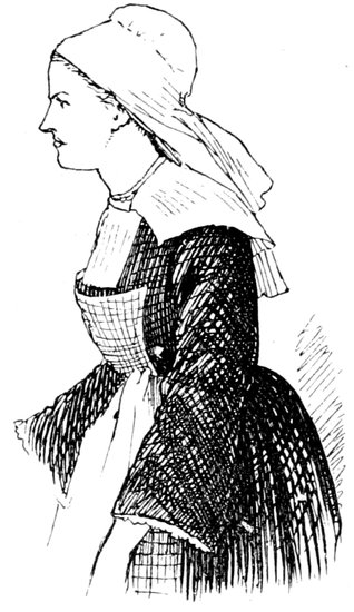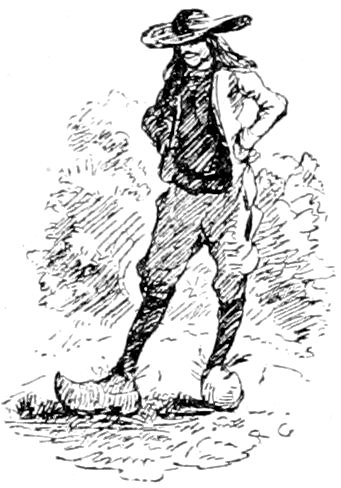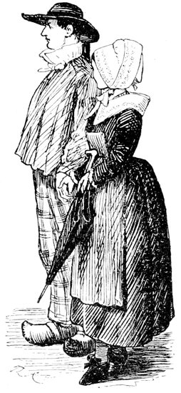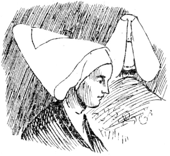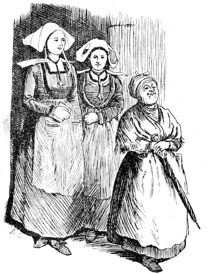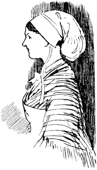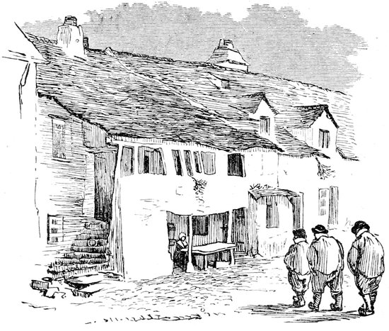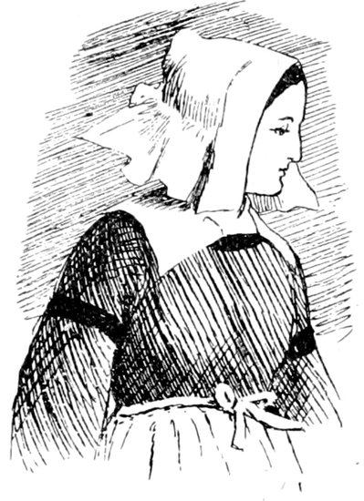 But excepting the visits of a few sportsmen and tourists in summer, Le Faouet is scarcely ever visited by the outer world. The houses are built of stone, old and covered with lichen; the 156covered market-place has heavy wooden eaves, and is protected by ancient elms; the inhabitants are dressed for the most part in rough and primitive fashion, the men in white cloth jackets, loose breeches, and sabots, and the women in dark comfortable cloth hoods, as in the sketch at the head of this chapter.