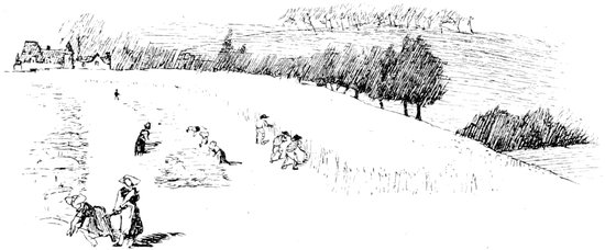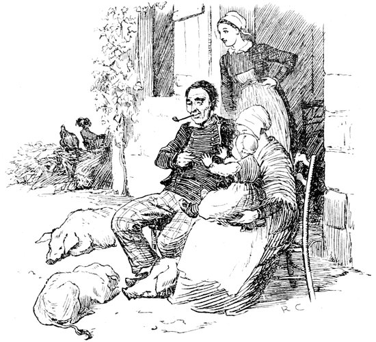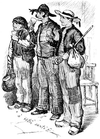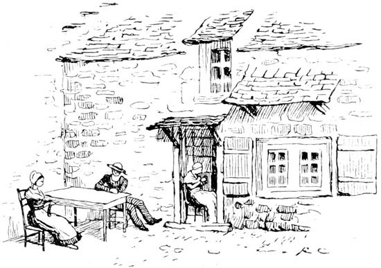 On one evening there is a great gathering at the old café with high-pitched roof, at the division of the two streets at the top of the sketch on page 165. The daughter of the popular hostess has been betrothed at the presbytery, and in a month she is to be married. She has her dot, or portion, of a few hundred francs, and her husband that is to be, his little farm; they have met to celebrate the occasion, and their immediate friends make merry until far into the night. They all sit together round a rough table in the little room, the lamps lighting the girls’ faces, the men in blouses or white jackets, with bright buttons; a background of timbered ceiling, smoke, laughter, songs, and jollity, continued long after the lights go out in the street and the moon rises over the valley. All will go well with them if the bottle which first drew them together does not scatter their happiness too soon.